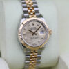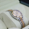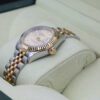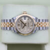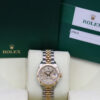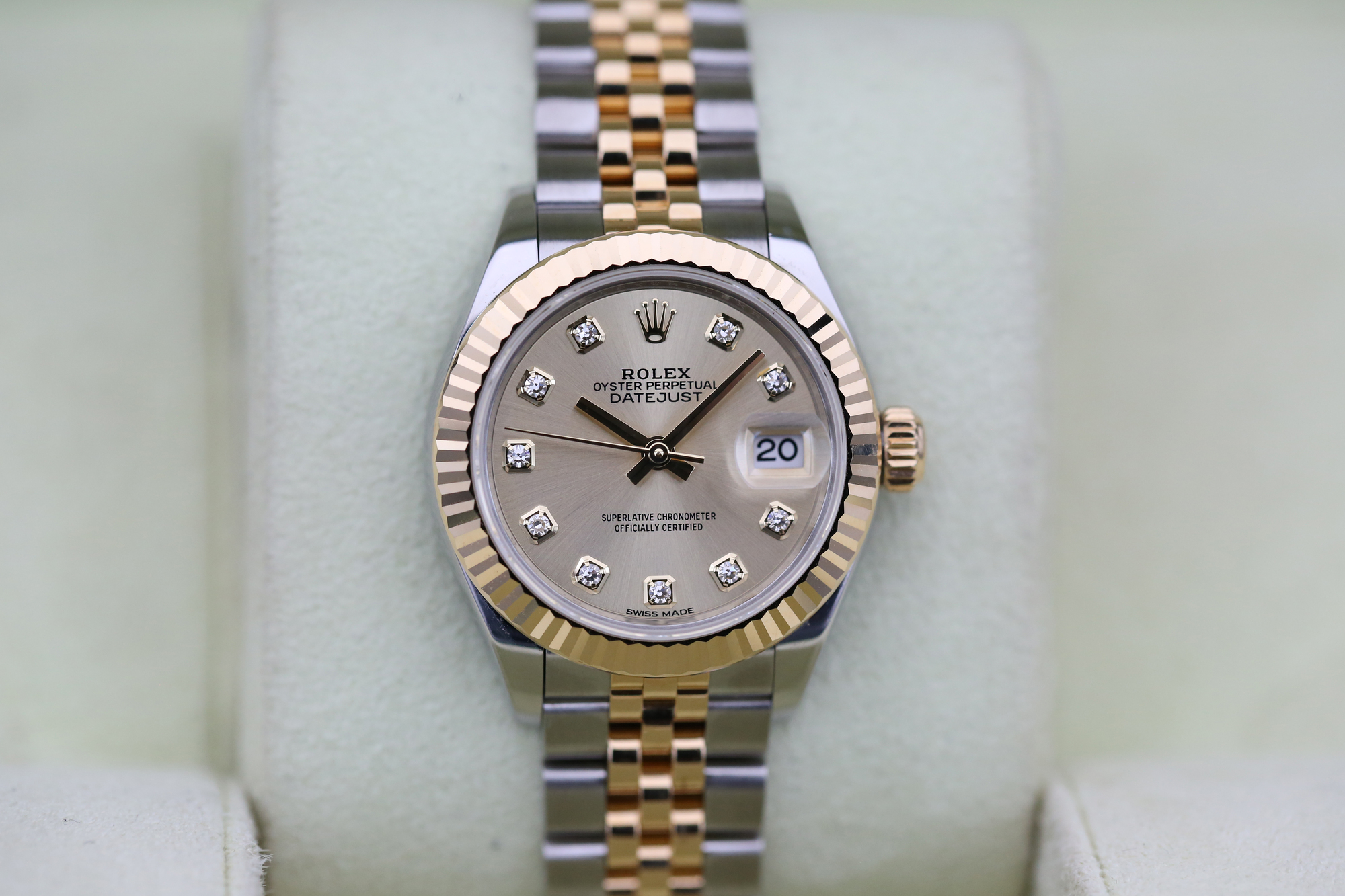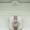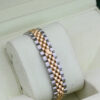 The watch is a beautiful combination of 18ct gold and oystersteel that features a stunning champagne dial, a date window at 3 o’clock, diamond hour markers and a 18ct gold fluted bezel.