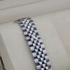 THIS WATCH IS A COMBINATION OF WHITE GOLD AND OYSTER STEEL THAT FEATURES A STUNNING WHITE DIAL, ROMAN NUMERAL HOUR MARKERS, DATE WIDOW AT 3 0’CLOCK AND A WHITE GOLD FLUTED BEZEL.