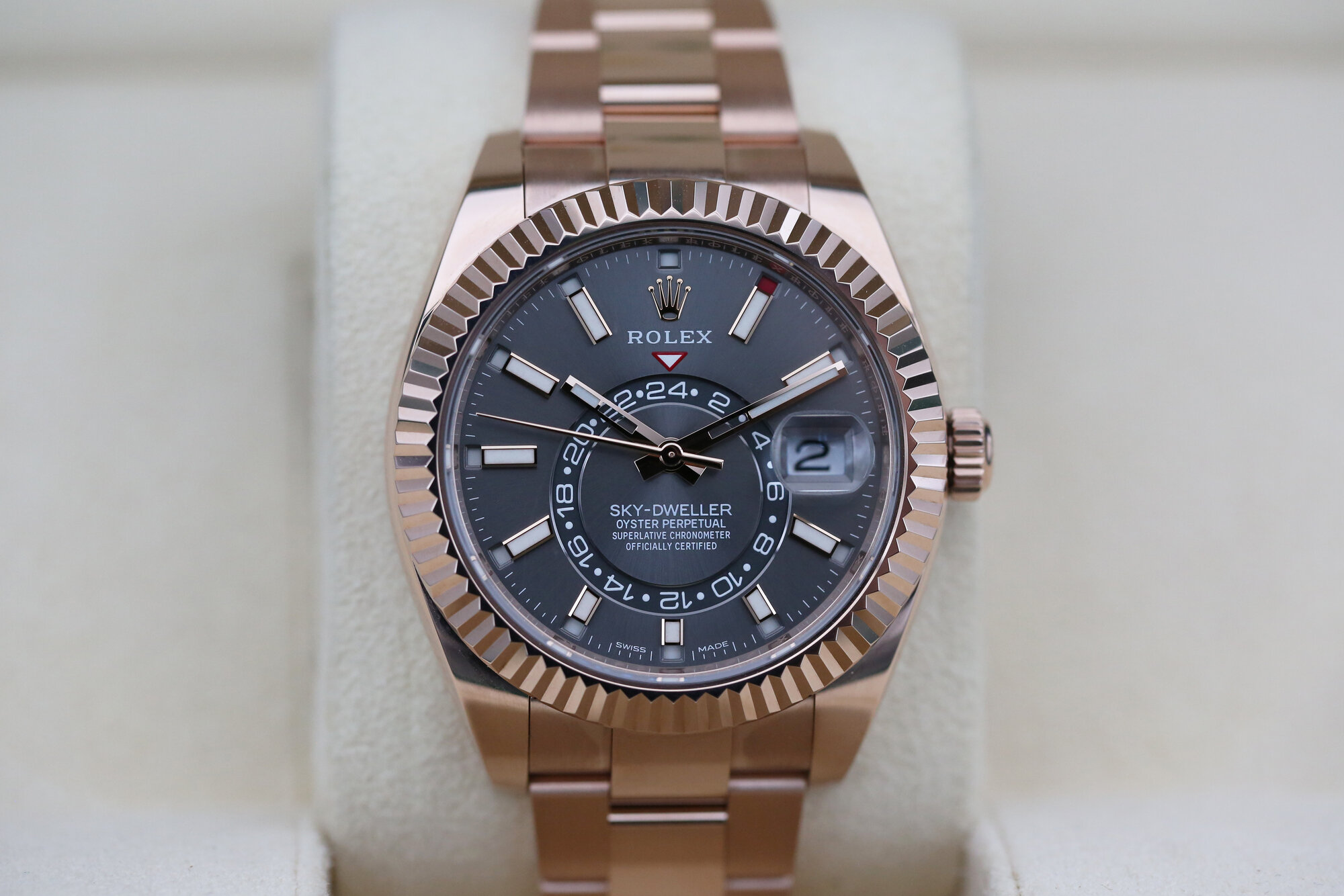 Here we have the Rolex Sky-Dweller– Rose Gold Rhodium