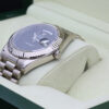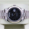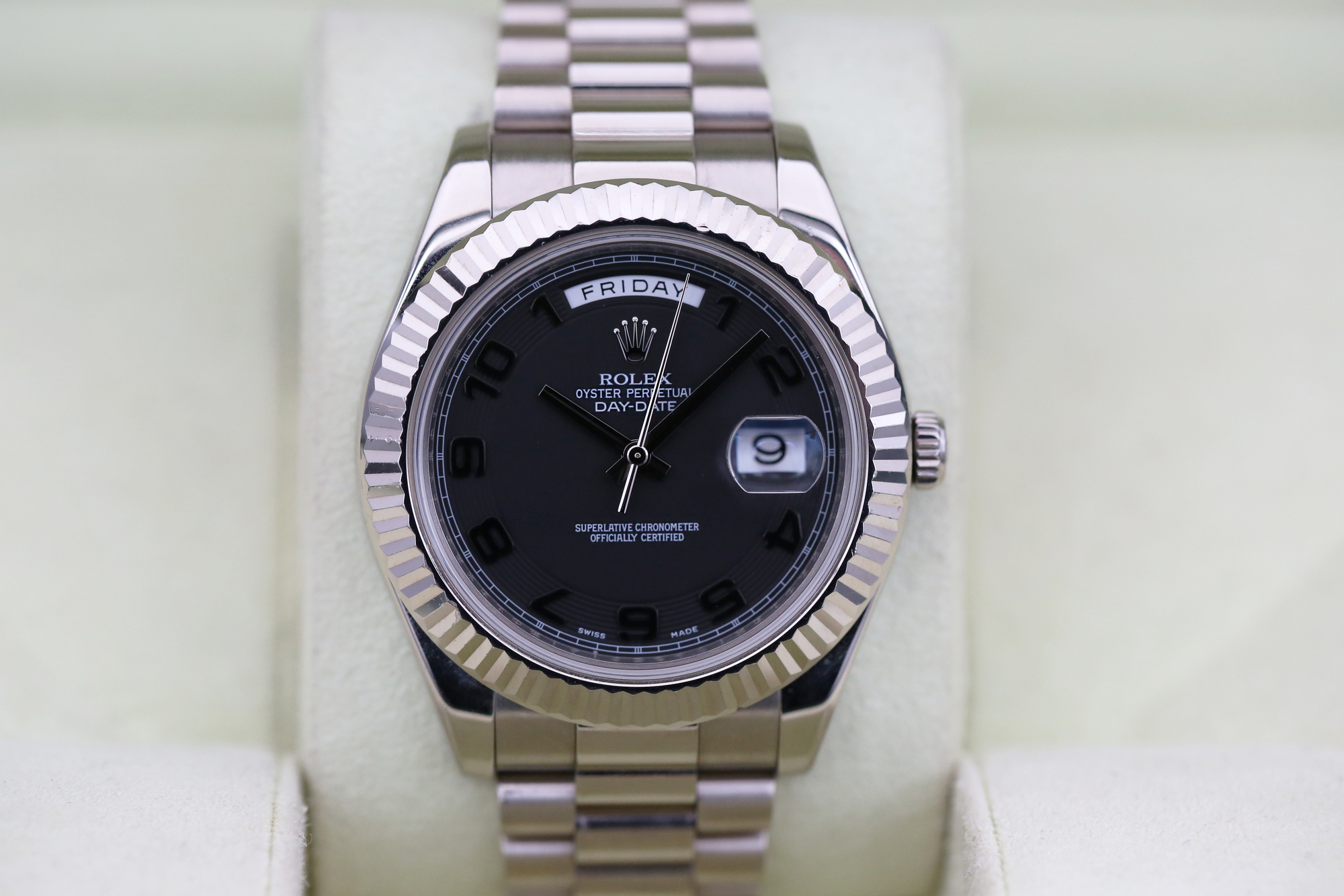 THE DAY-DATE BOASTS A STYLISH BLACK DIAL, ARABIC NUMERAL HOUR MARKERS, DAY WINDOW AT 12 0’CLOCK, DATE WINDOW AT 3 O’CLOCK AND HAS A FLUTED BEZEL.