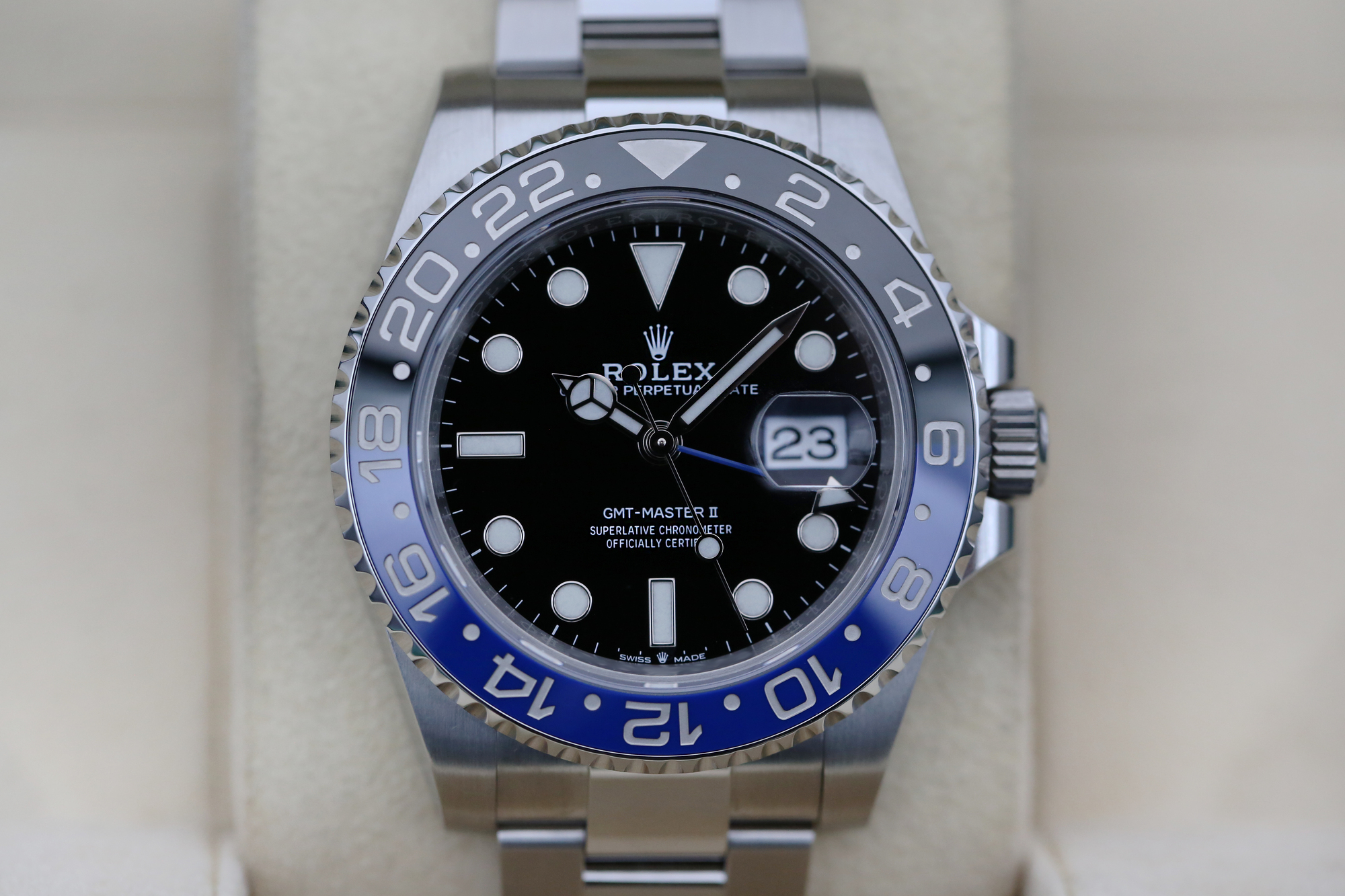 THIS WATCH FEATURES A STYLISH BLACK DIAL AND A CERACHROM BEZEL WITH BLUE AND BLACK CERAMIC INSERT, THIS COLOUR COMBINATION ON THE OYSTER BRACELET IS AFFECTIONATELY KNOWN IN THE INDUSTRY AS “THE BATMAN”.